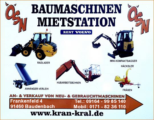 Die Firma KRAN-KRAL bietet Ihnen Baumaschinen, Baugeräte, Hubbühnen, Anhänger, Industrie-, Klein- sowie Gartengeräte kostengünstig zum Mieten an.